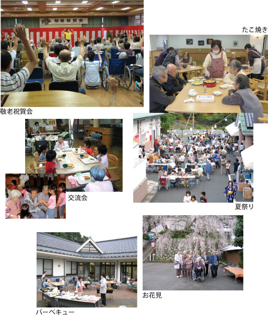 明るいデイルームで楽しい会話がはずみます。 ゲームやレクレーションで和やかなひと時をお過ごしいただけます。 バランスのとれた献立で温かい食事を提供いたします。 寝たきりの方でも安全、快適にご入浴いただけます。